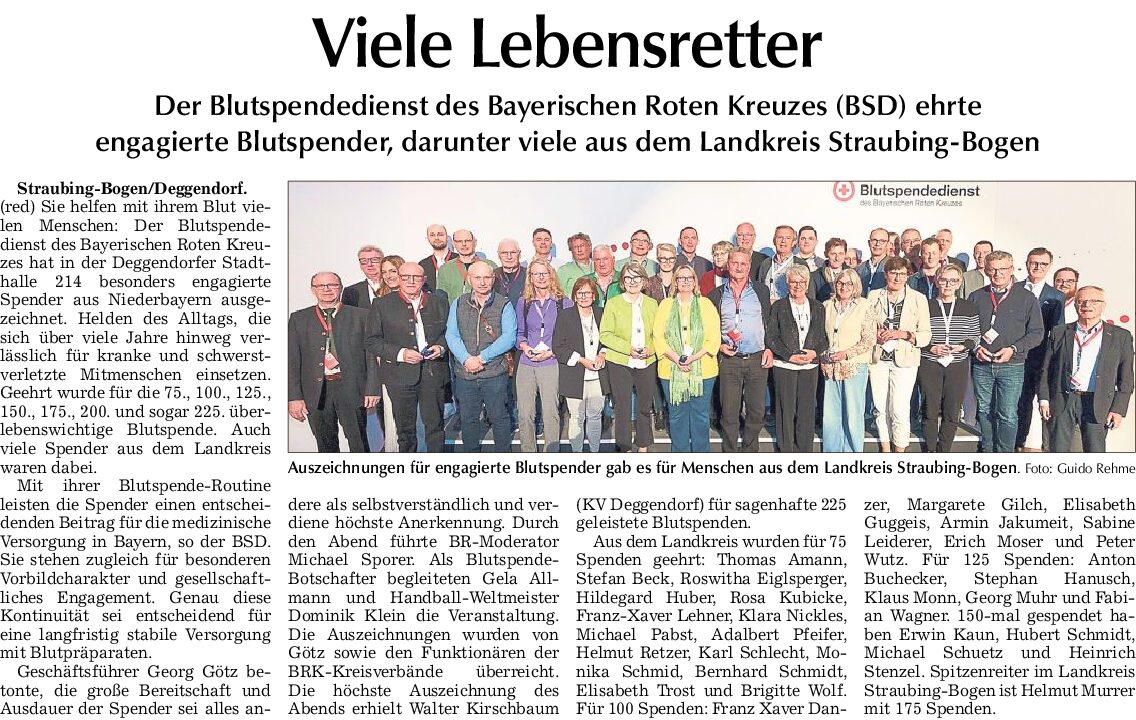 Der Blutspendedienst des Bayerischen Roten Kreuzes (BSD) ehrte engagierte Blutspender, auch aus der Gemeinde Straßkirchen