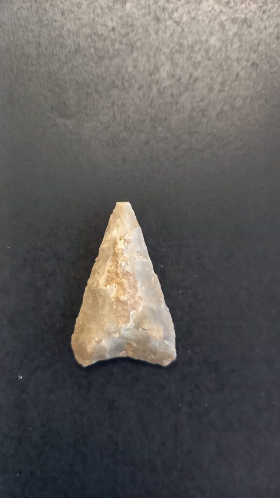 Foto der jungsteinzeitlichen Pfeilspitze aus Feuerstein (Silex), deren vordere Spitze vermutlich aufgrund des Aufpralls an einem Zielobjekt bereits vor Jahrtausenden abgebrochen ist.