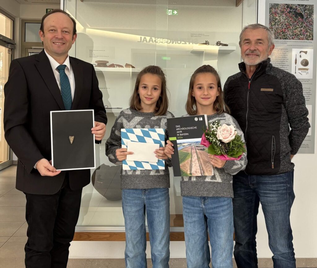Die Entdeckung zeigt, wie wichtig aufmerksame Augen und Neugier auch heute noch sind – denn Geschichte liegt manchmal direkt vor unseren Füßen. Die Schwestern Valentina und Victoria sind schon mehrmals bei den geschichtlichen Jugendangeboten des Gäubodenmuseums Straubing dabei gewesen und freuten sich über ein Buch zur Straßkirchner Gemeindegeschichte, sowie über einen Verzehrgutschein einer örtlichen Straßkirchner Gaststätte. Dr. Husty hatte einen Bildband zur Archäologie in Bayern für die junge „Forscherin“ im Gebäck dabei, den diese gerne entgegen nahm.