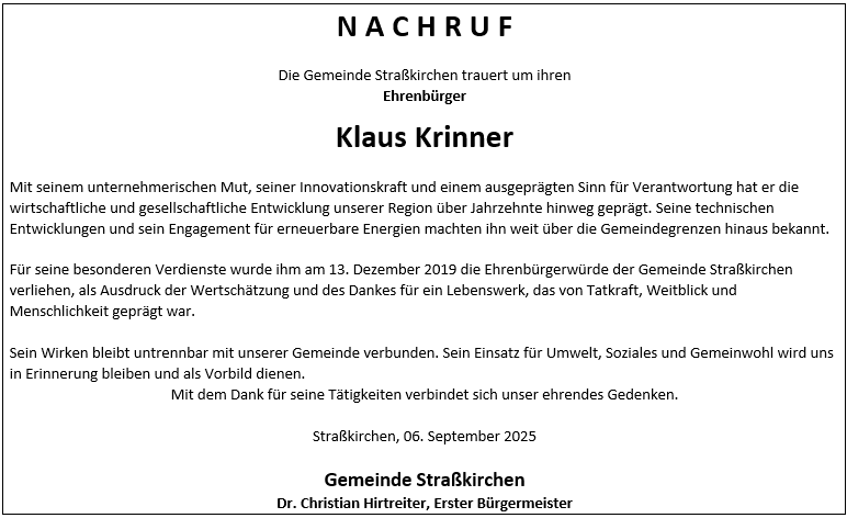 Die Gemeinde Straßkirchen trauert um ihren Ehrenbürger Klaus Krinner