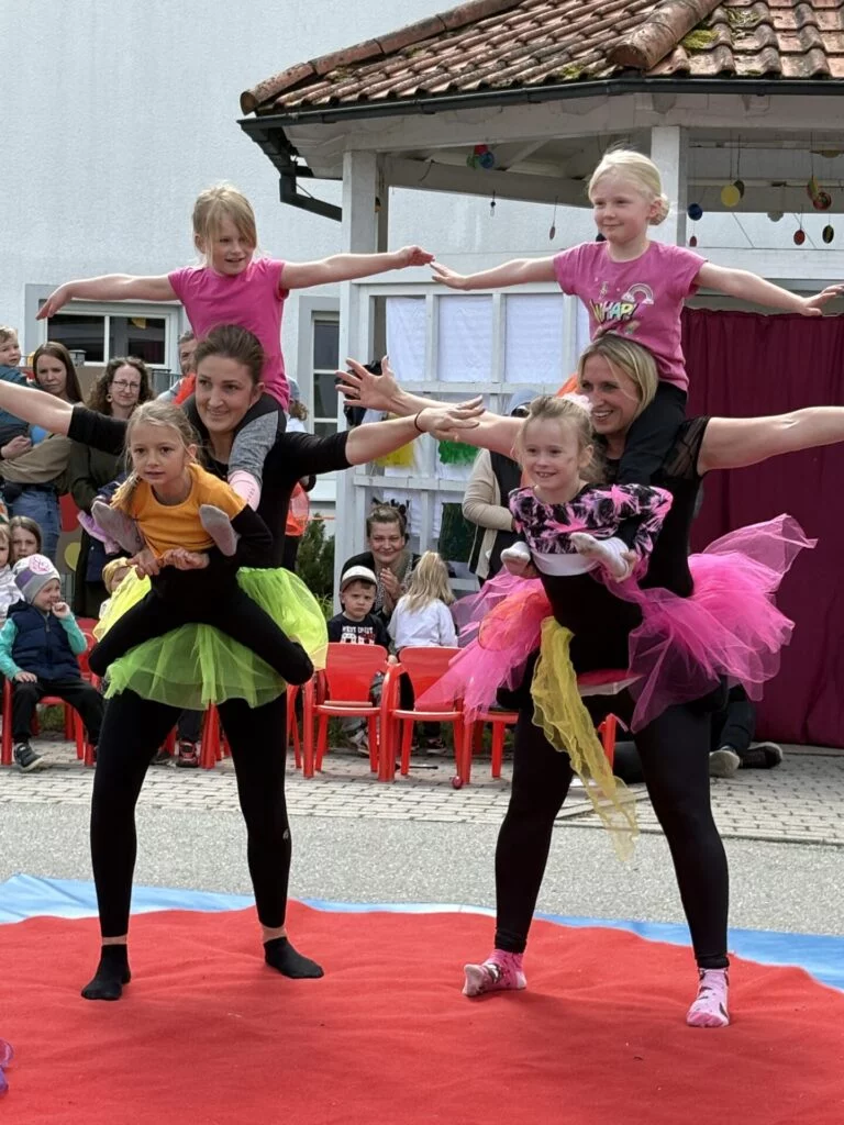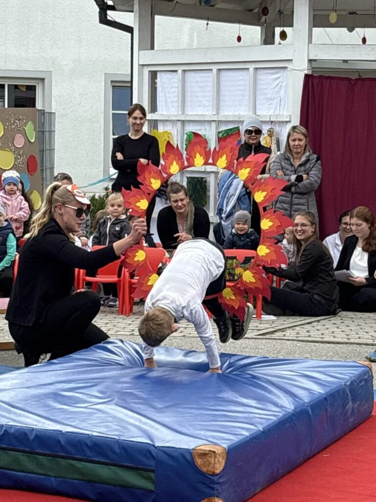 Die höchst engagierten Mitarbeiterinnen des Kindergartens St. Elisabeth hatten sich richtig ins Zeug gelegt und für den Nachmittag nicht nur die Zirkusvorführungen mit die farbenfrohen Löwen-Schau (Kinder mit Masken) und Musikumrahmungen, eine Seil-Tanz-Akrobatik gleichsam als ein szenisch-musikalisches Tanzspiel, bei dem sich ein Mädchen träumend in ihrer Kindergartenzeit über die Zirkusarena bewegte und weitere Dompteure sich in hervorragenden Darbietungen dem begeisterten Publikum vorstellten. All diese Abschnitte wurden szenisch-musikalisch von den Kindern mit großer Begeisterung begleitet. Die Mitarbeiterinnen mit der Kindergartenleitung Steffi Ringlstetter hatten höchste Kreativität an den Tag gelegt und sogar musikalisch und tänzerisch vielseitige Präsentationen einstudiert.