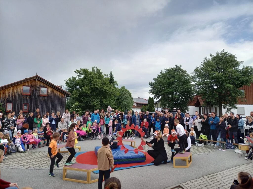 Zu Beginn der Jubiläumsveranstaltung „Maifest und 30-jähriges Kindergartenjubiläum“ wurde darauf hingewiesen, dass sich gerade beim Veranstaltungsbeginn die Regenwolken über dem Kindergarten verzogen und somit im Freigelände der wunderbare Auftritt des kindergarteneigenen „Zirkus Konfetti“ möglich wurde. Bürgermeister Christian Hirtreiter freute sich, dass seit Januar 1995 die Kindergartengruppen „Bärenhöhle“ und „Mauseloch“ zu den festen Institutionen in der Gemeinde gehören. Und er wagte ein Ausblick in die Zukunft, dass in Bälde auch zwei weitere große Räumlichkeiten für Kinderkrippe-/Kindergartengruppen angebaut werden um das Angebot für die Gemeinde zu erweitern. Er freute sich, dass viele ehemalige Kolleginnen bei der „Geburtstagsparty“ anwesend waren und hob die Kontinuität hervor.